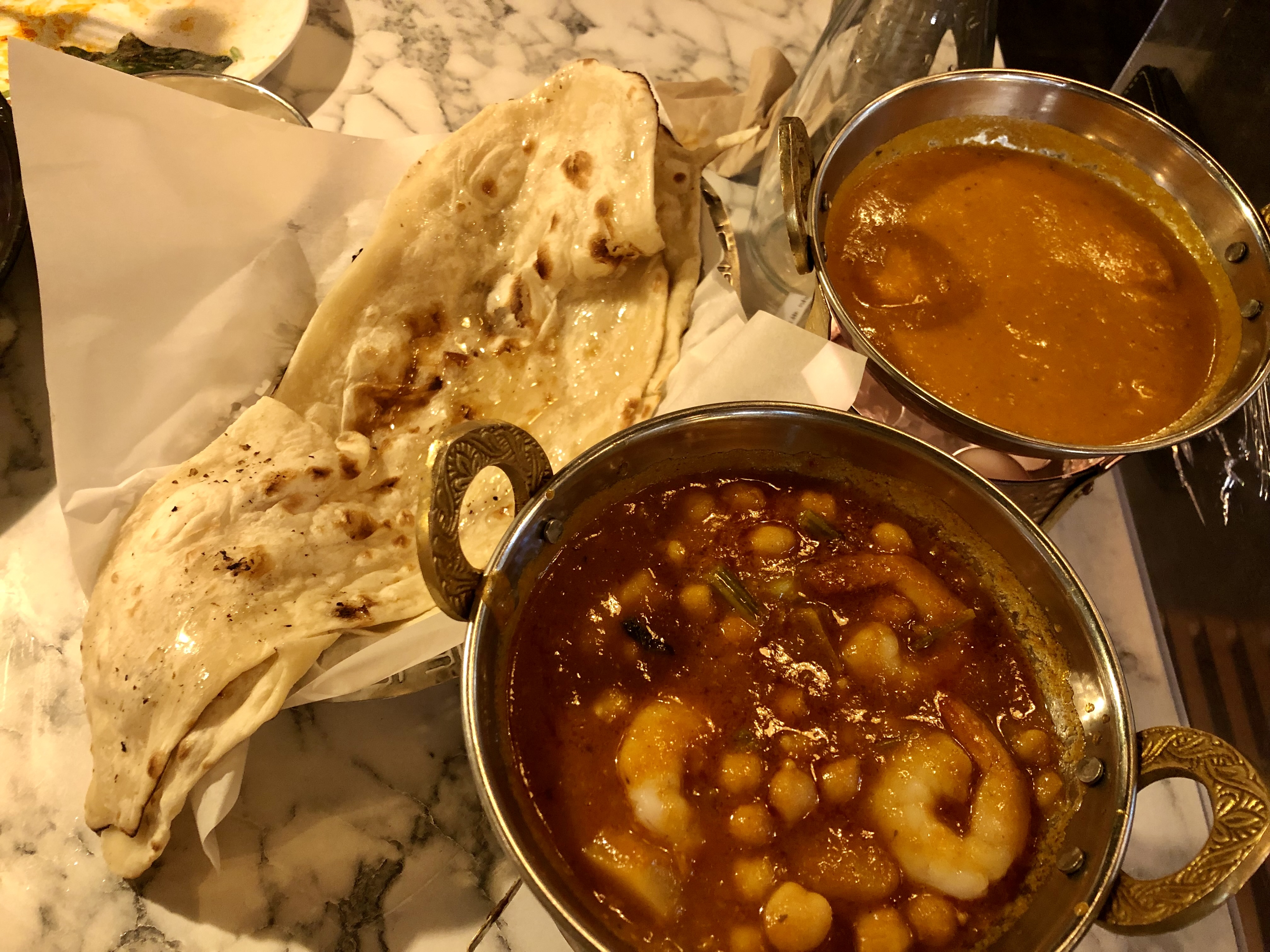 그리고 나온 난과 커리입니다. 허니버터 난과 갈릭 난으로 주문했습니다. 커리는 버터치킨 마크니와 로얄 프로운 커리를 골랐어요. 개인적으로는 달달한 버터치킨 마크니가 더 맛있었어요. 로얄 프로운 커리에는 병아리콩이 들어있고 살짝 매콤합니다.