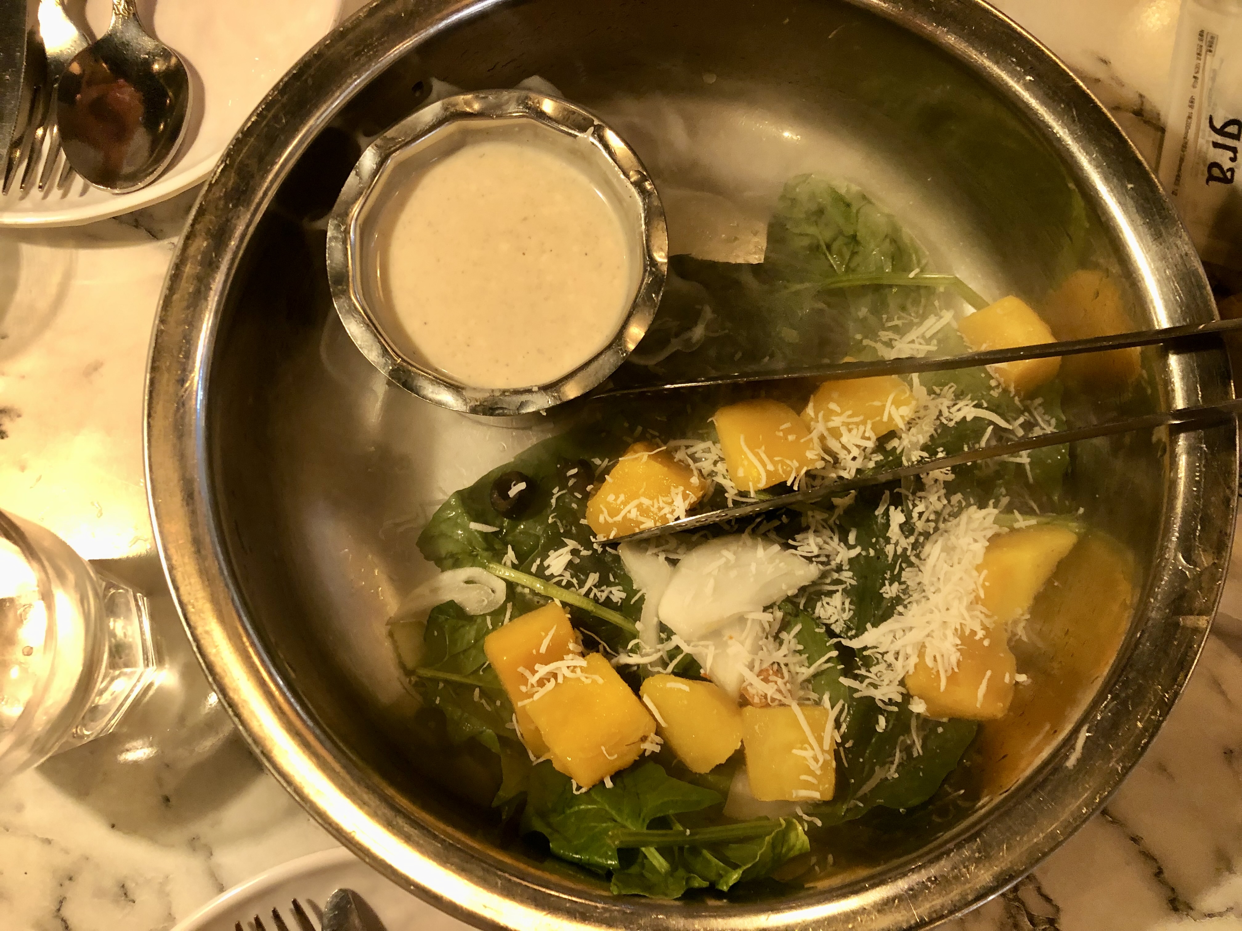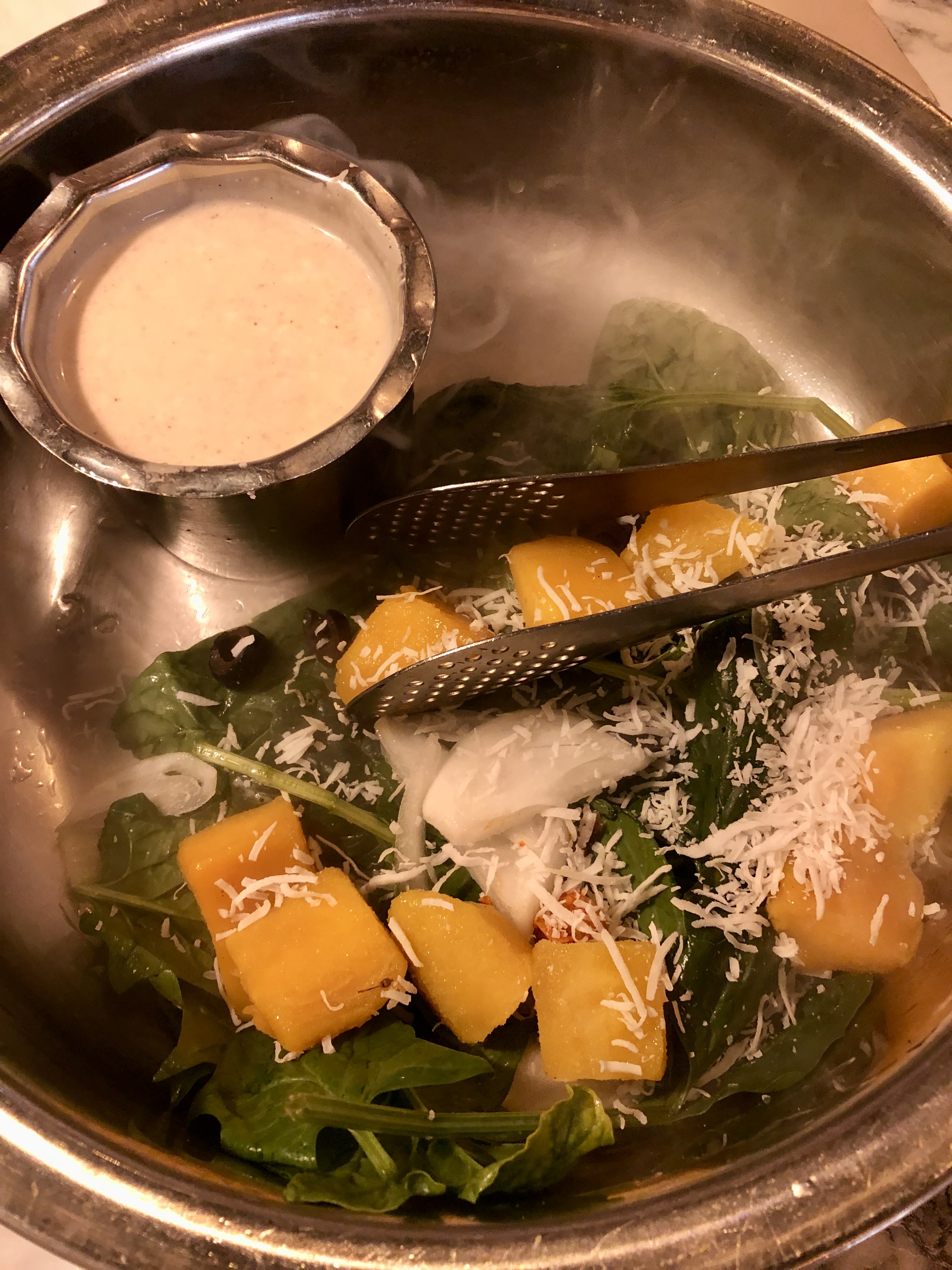 제일 아래에 난 같은 빵이 깔려있고 그 위에 각종 야채와 망고가 올라가져있어요. 옆에 있는 소스는 갈릭 드레싱 같았어요.