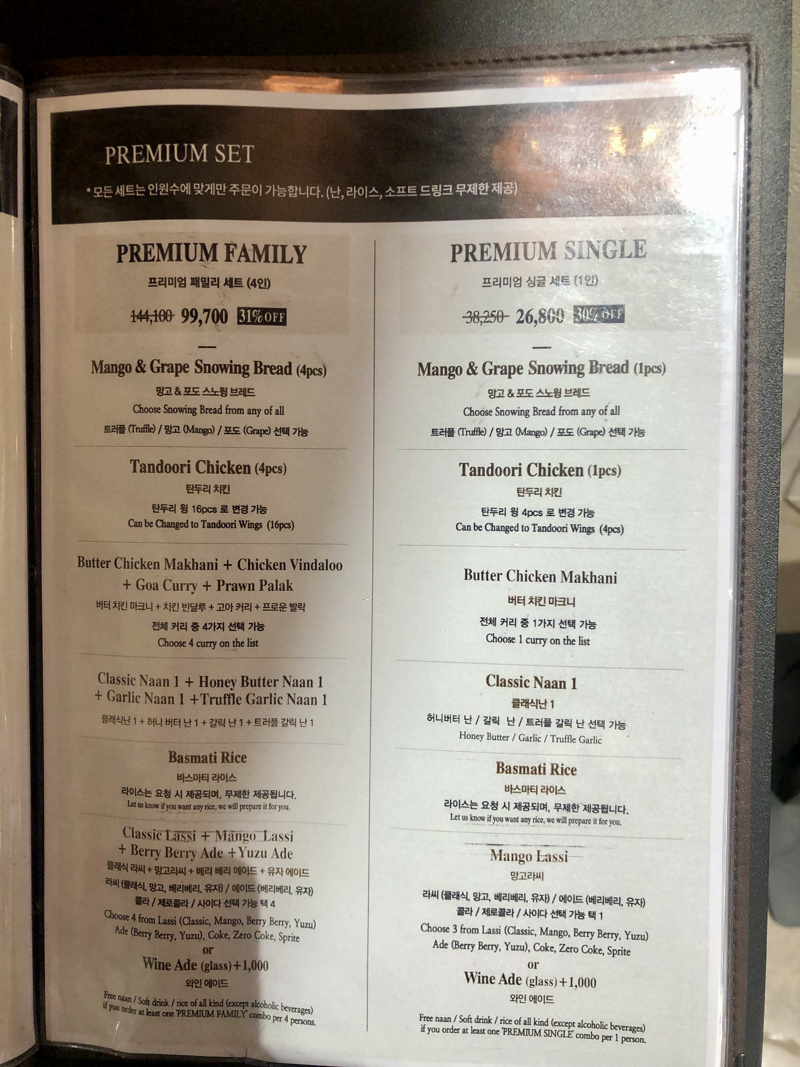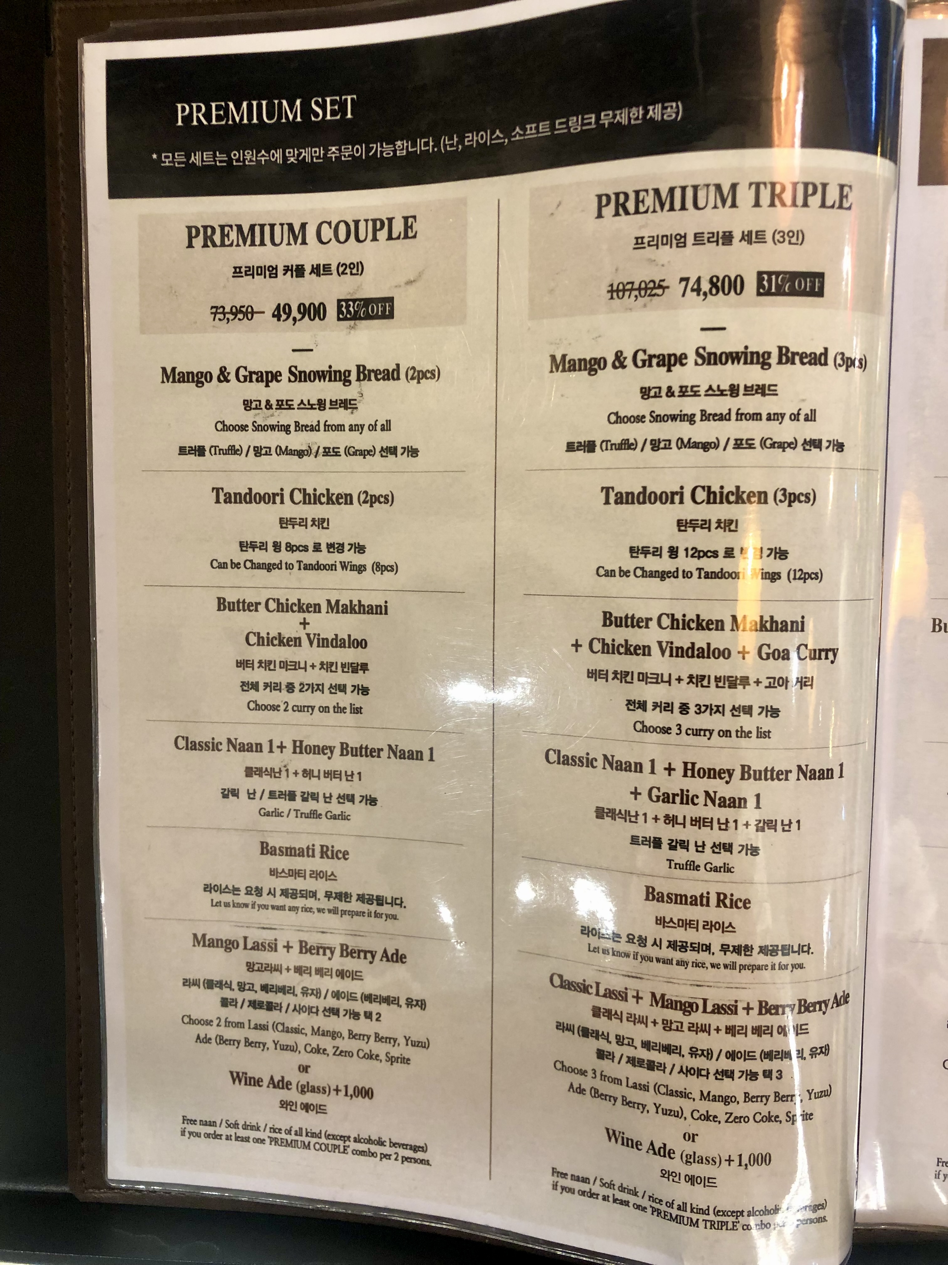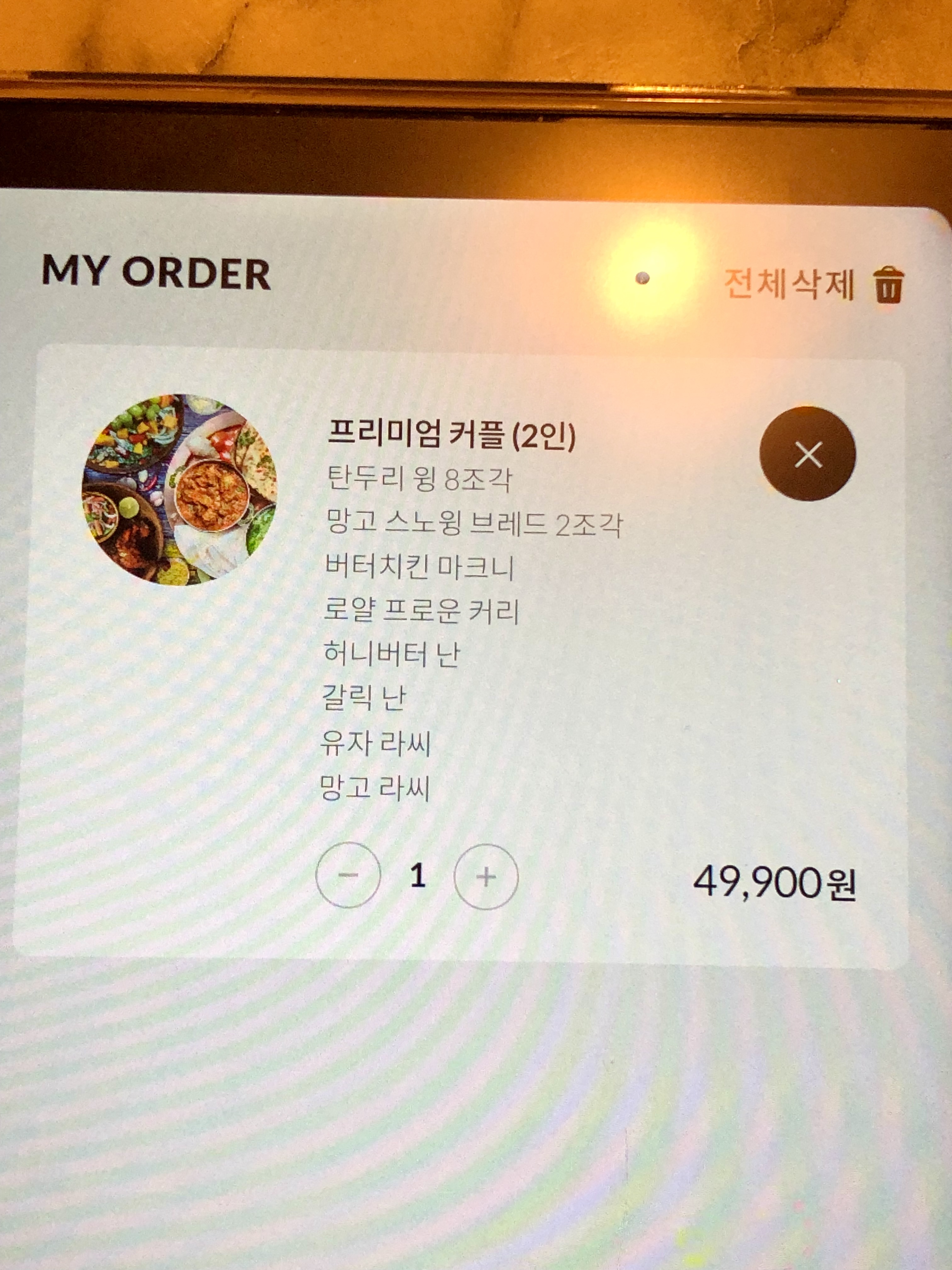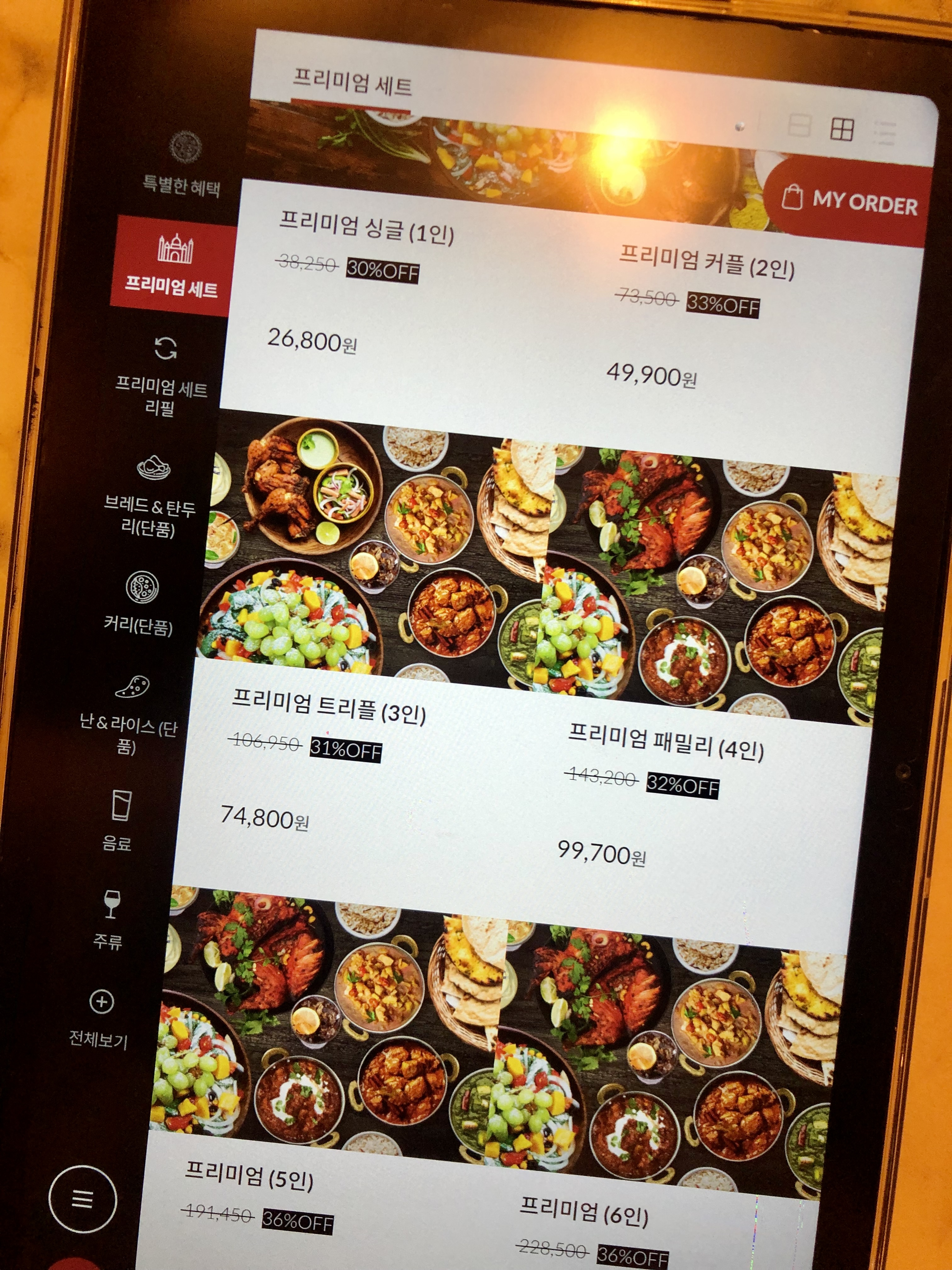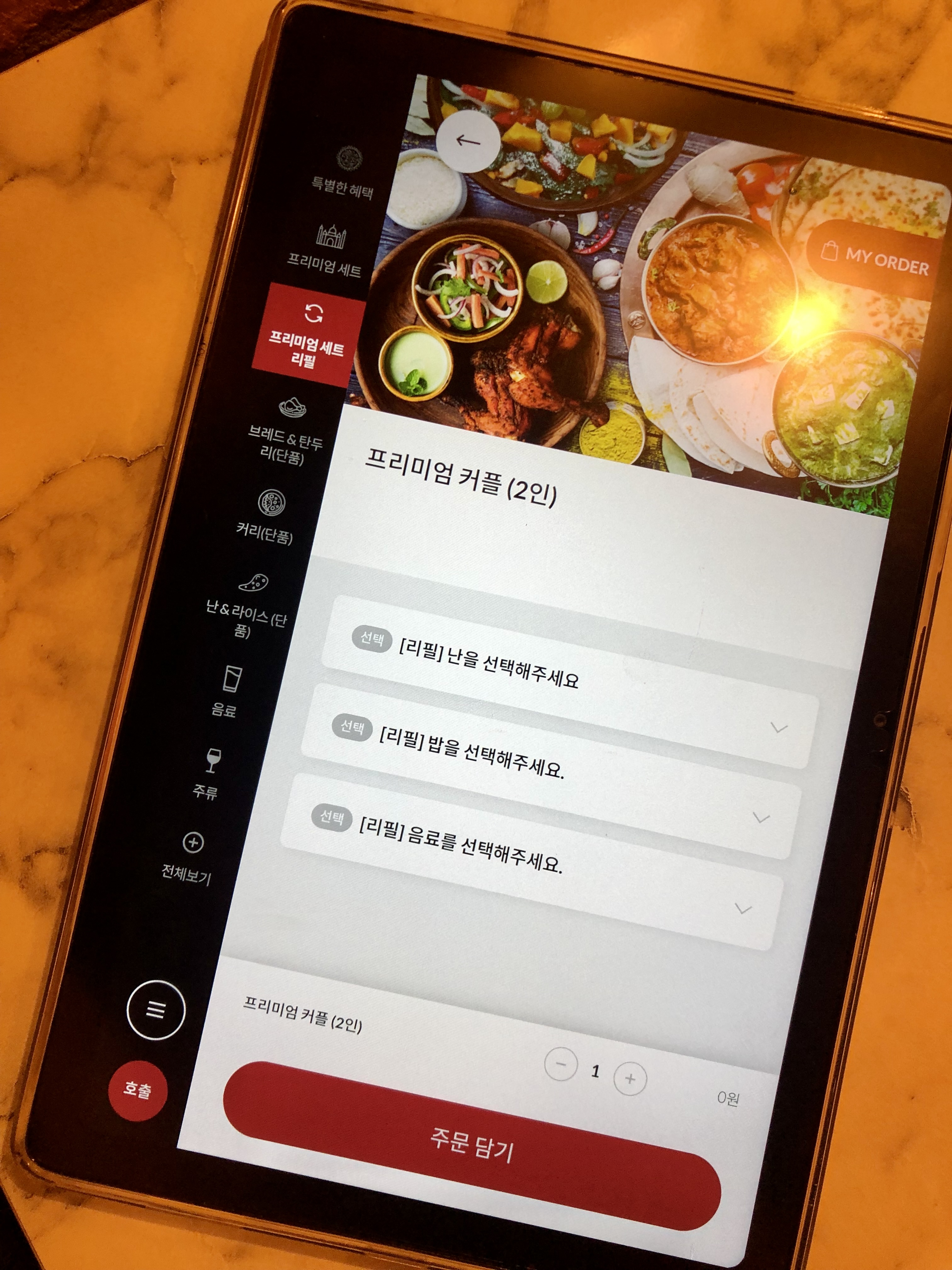 주문은 테블릿으로 가능합니다. 저는 프리미엄 2인 세트를 주문했어요. 여기엔 고기, 샐러드, 커리 2종류, 난 2종류, 음료 2종류를 선택할 수 있게 돼있습니다. 밥은 리필메뉴에서 주문 가능한데 금방 나오니 필요할 때 주문하셔도 됩니다.