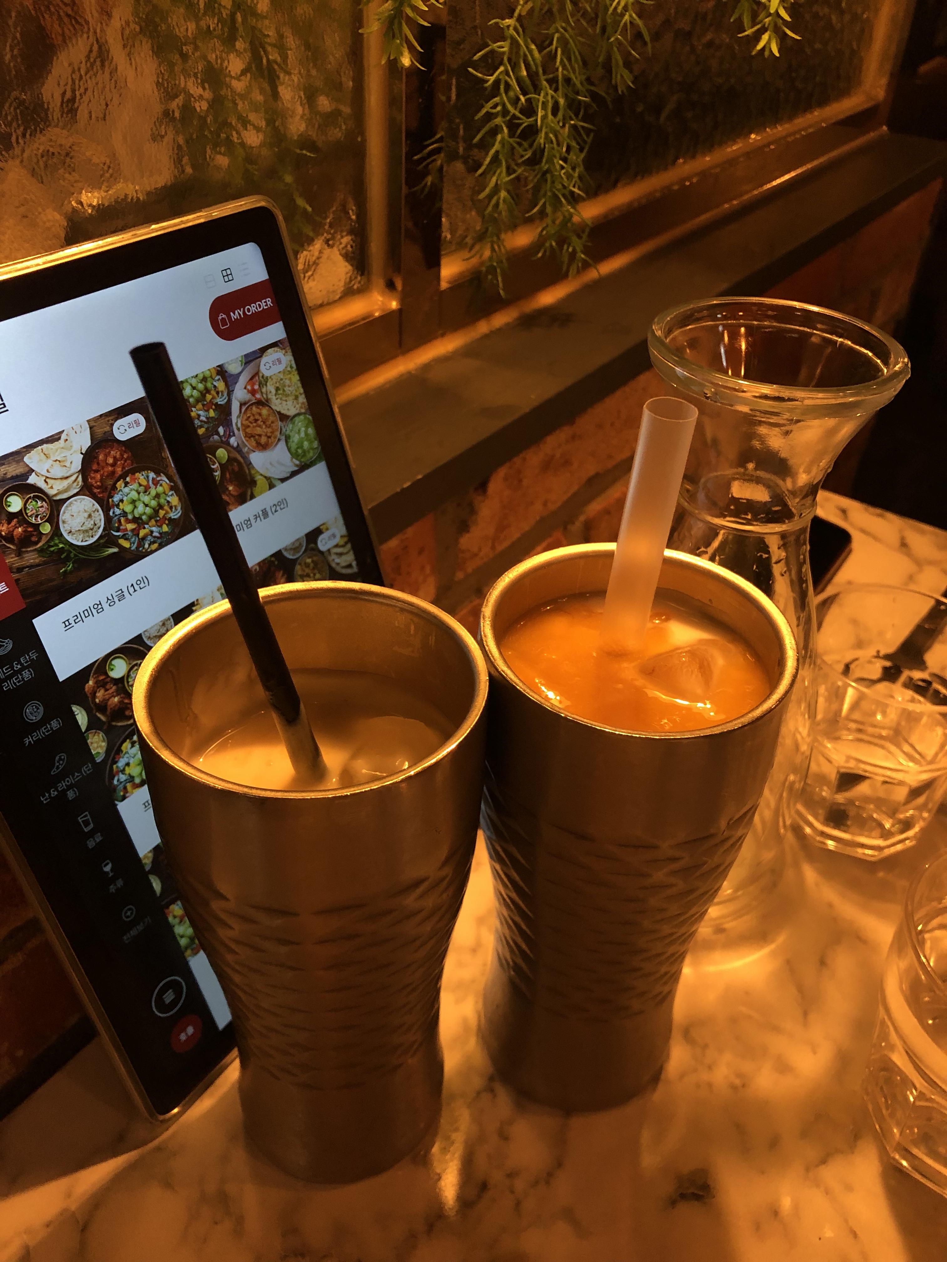 유자 라씨와 망고 라씨입니다. 라씨는 정말 달더라고요. 저는 물을 조금 더 타서 마셨습니다. 라씨를 좋아하신다면 다 마신 후에 계속 리필해서 마실 수 있어요. 아니면 탄산음료로도 리필 가능하답니다.