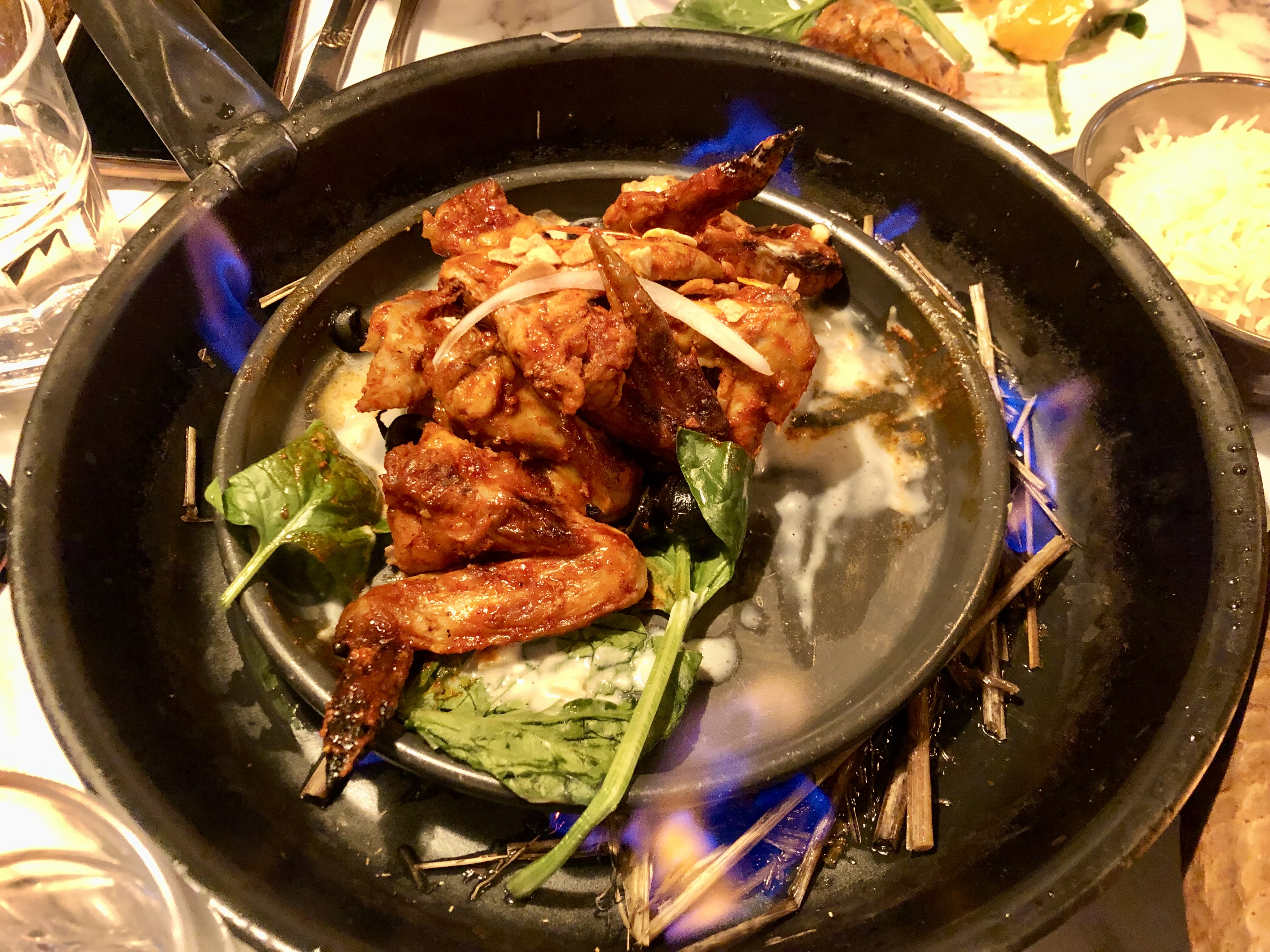 탄두리 윙 8조각입니다. 직원분이 그릇 밑에 있는 지푸라기 같은 것에 불을 붙여줍니다. 계속해서 따뜻하게 유지하며 먹을 수 있었어요. 남편은 심지어 저 불에 윙을 직화구이 해서 먹었습니다.