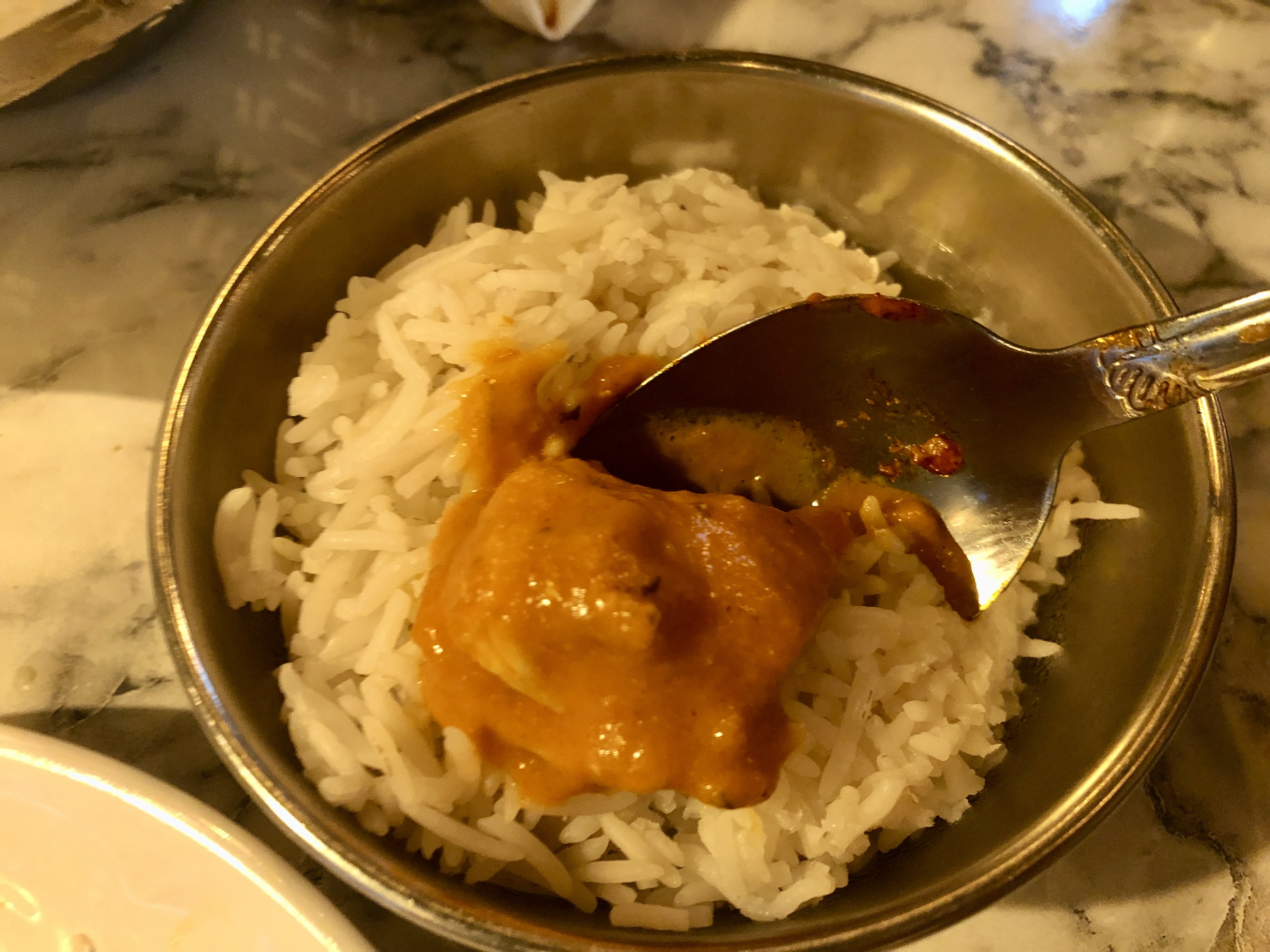 추가로 요청한 바스마티 쌀밥에 버터 치킨 마크니를 비벼 먹어 봅니다. 정말 꿀맛이에요. 밥은 반 공기 짜리와 한 공기 짜리가 있어요. 위 사진이 반 공기 짜리인데 수북히 쌓아줘서 절대 적지 않습니다. 밥은 정말 금방 나오니 필요한 만큼한 주문해 먹는 것도 방법일 것 같아요.