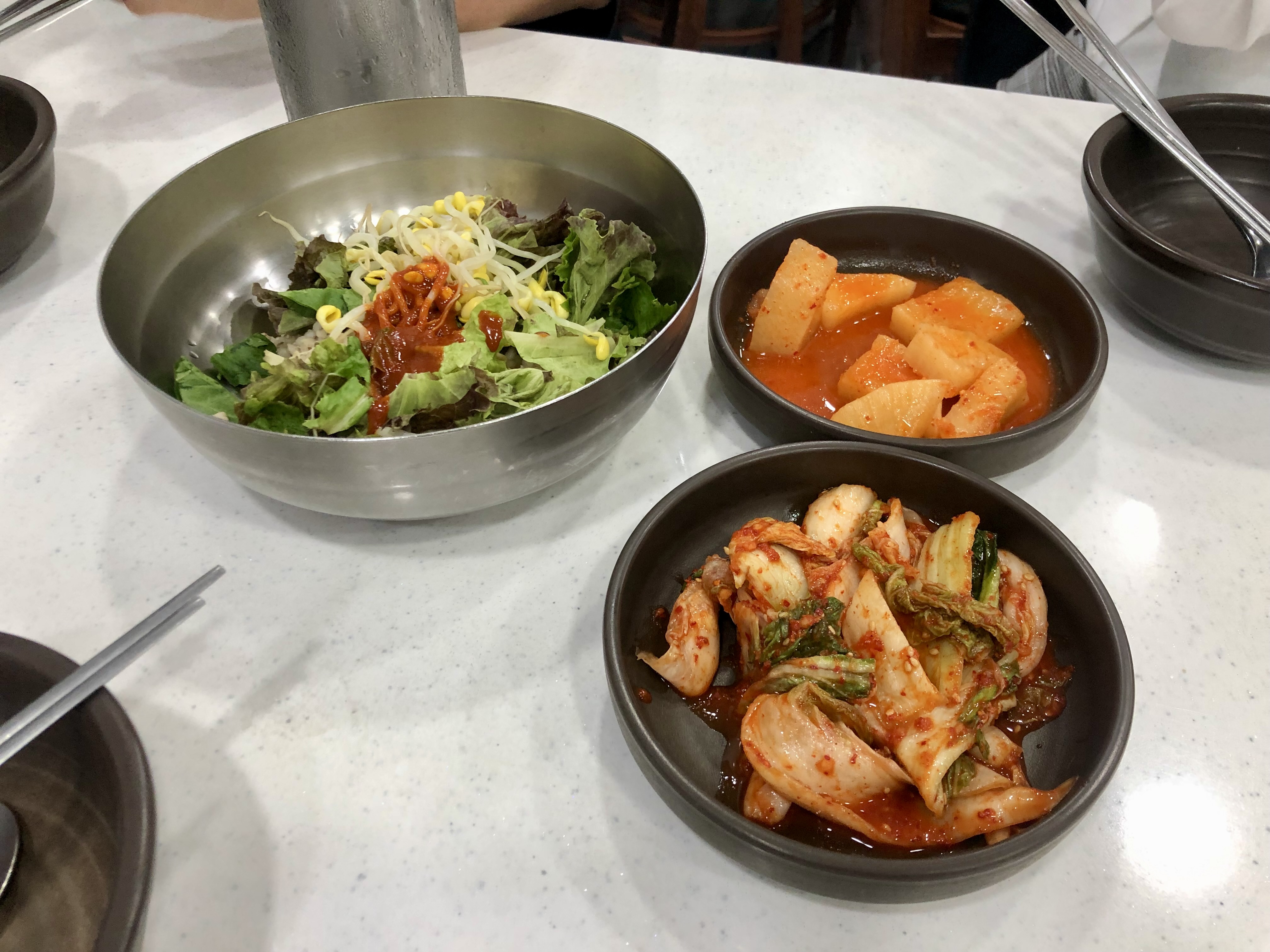 밥을 먹기 전에 보리밥 비빔밥이 조금 제공됩니다. 두 종류의 김치는 모두 맛있었어요.