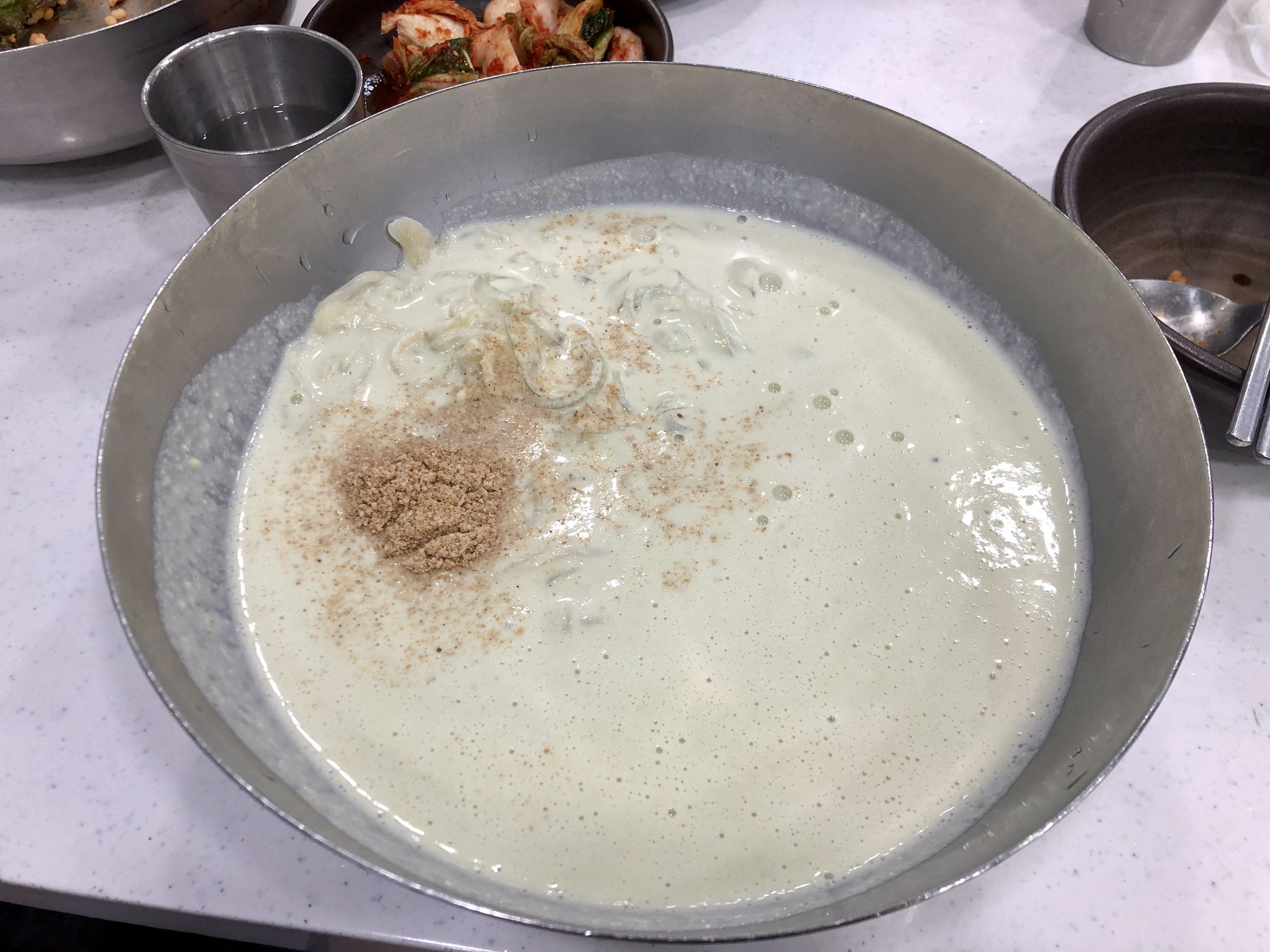 딱 봐도 콩국물이 맛있을 것 같이 생겼습니다. 콩국물을 아낌 없이 담아 주셔서 처음엔 면이 잘 보이지 않아요.