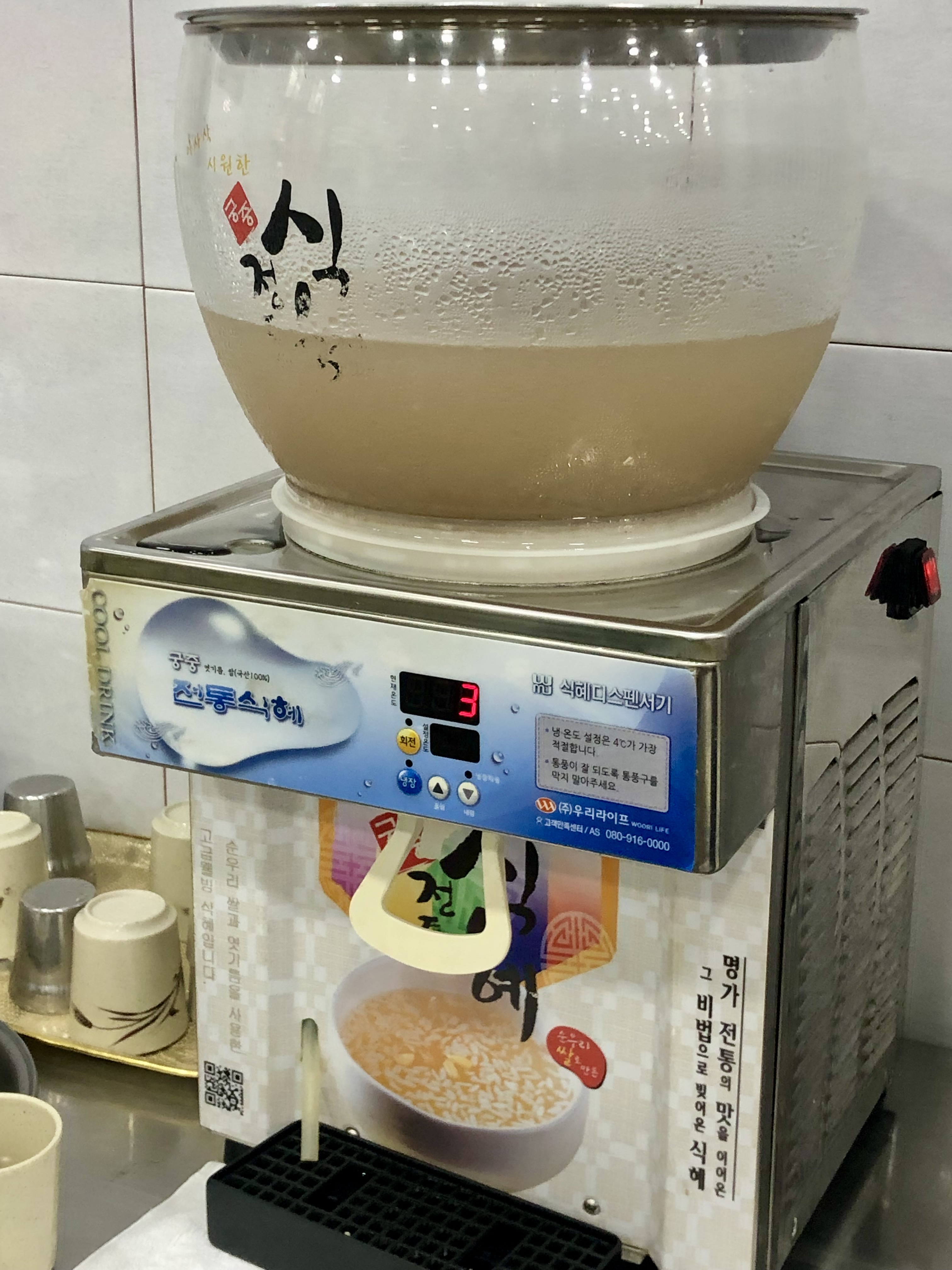 그리고 후식으로 식혜도 마실 수 있습니다. 컵은 테이블에 가져다주시는 물컵을 사용하면 돼요. 기계 옆에 있는 컵들은 전부 사용한 컵이었습니다.