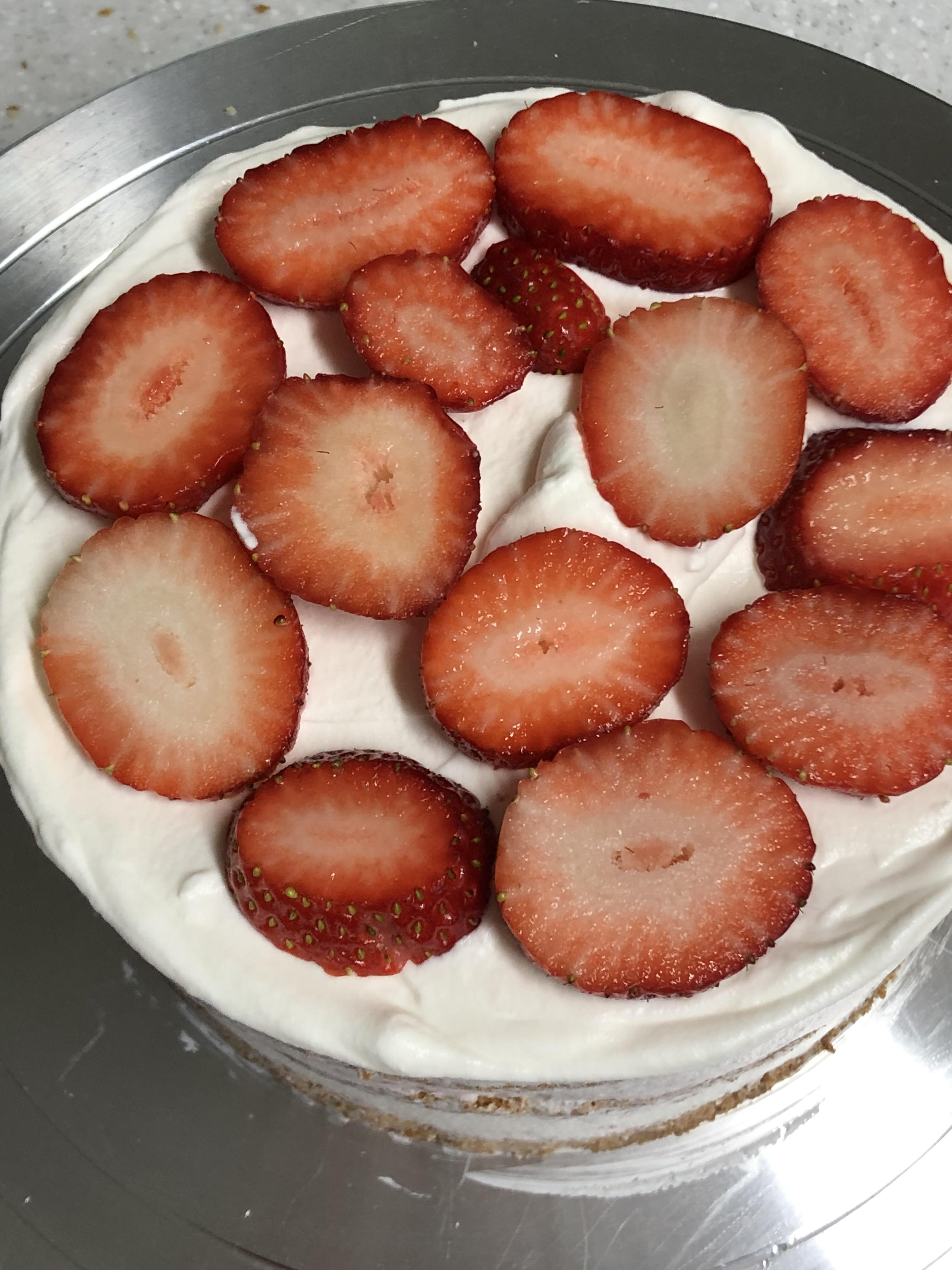 케이크 시트를 올리고 다시 흰색 크림 1/4을 올립니다. 딸기를 올리고 다시 1/4 크림을 올립니다.