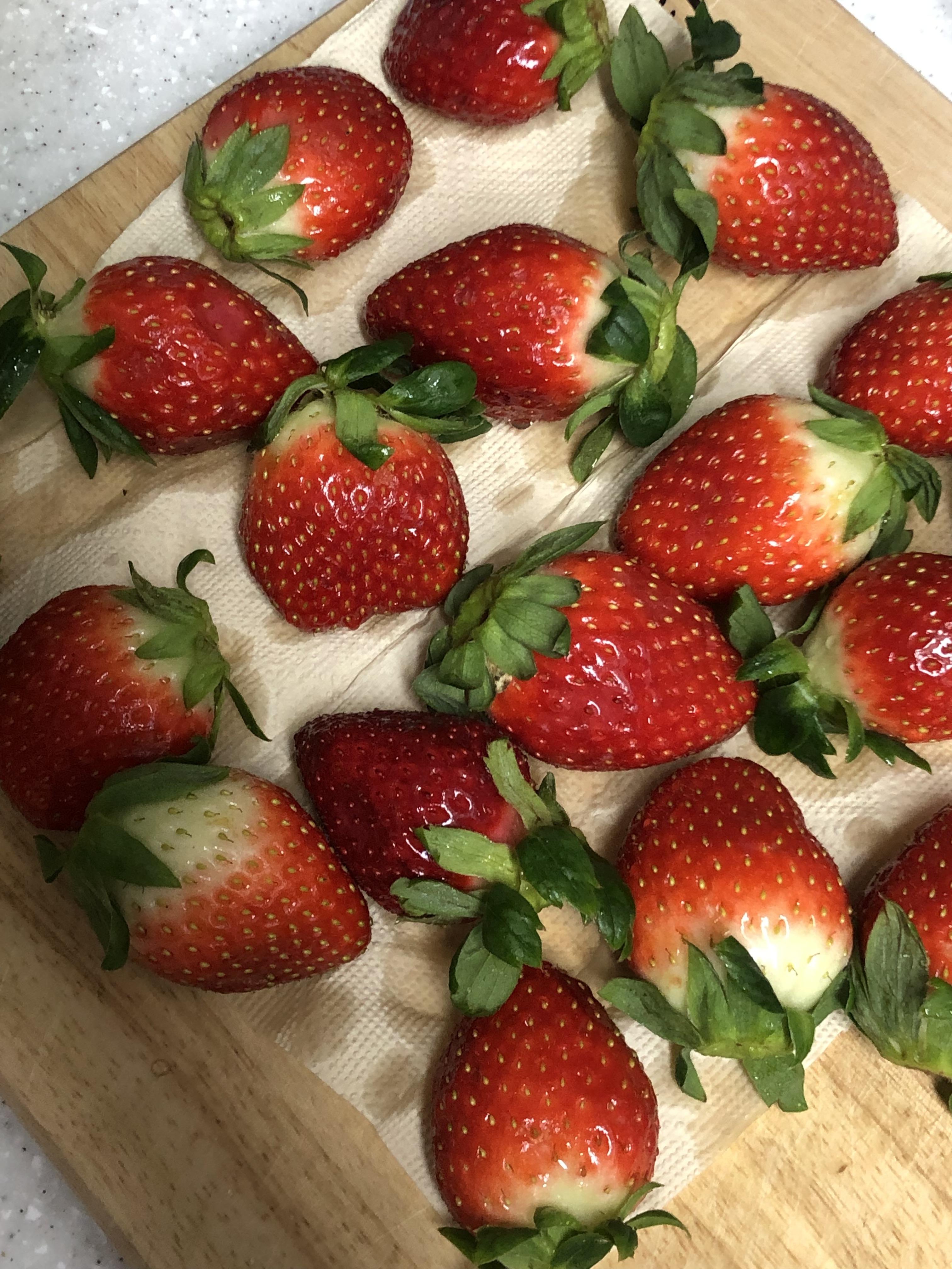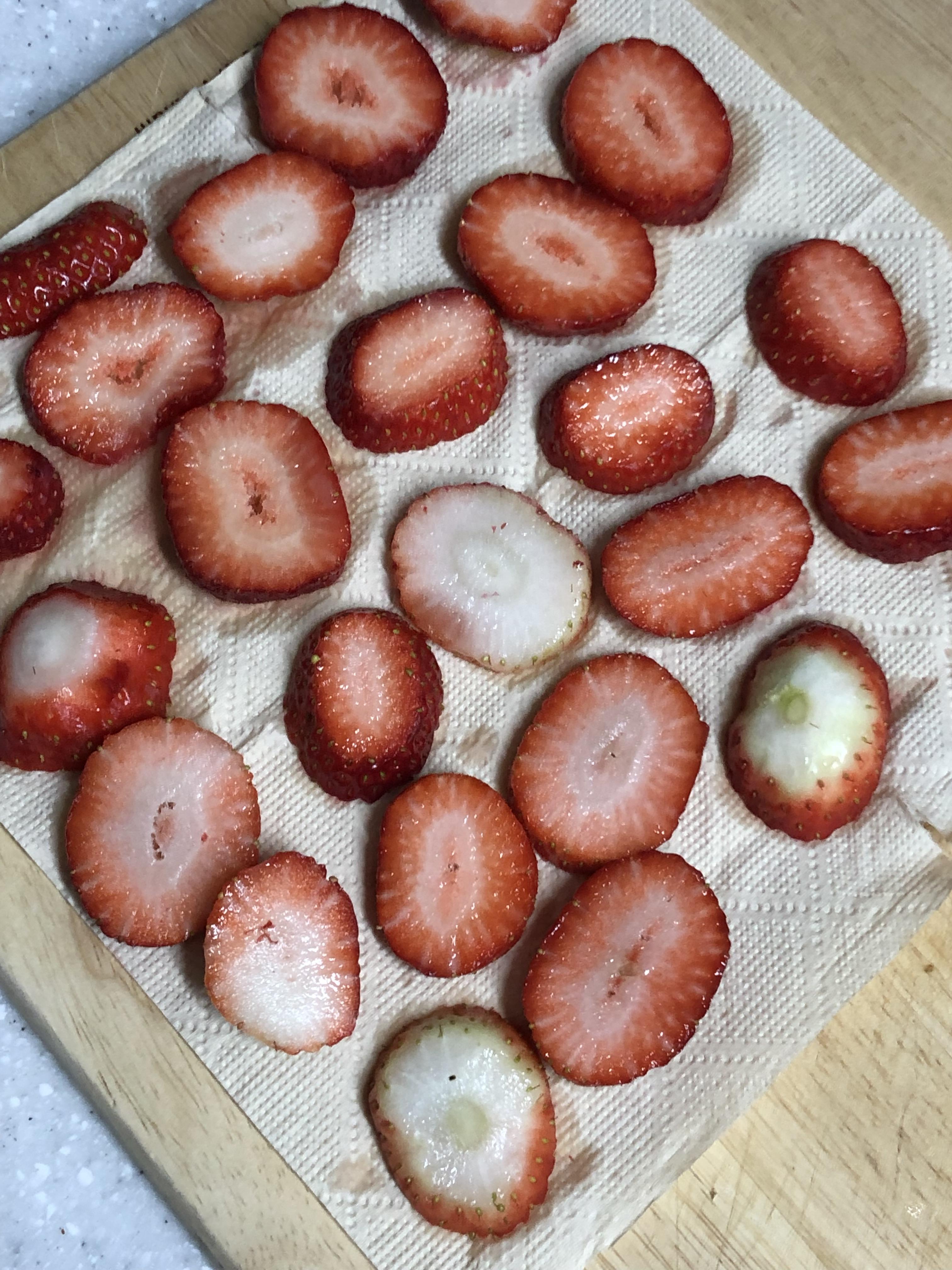 딸기는 물에 오래두면 쉽게 무르기 때문에 가볍게 세척한 뒤 물기를 잘 제거해줍니다. 케이크 시트를 1cm로 잘랐기 때문에 딸기는 0.5cm 정도의 두께로 슬라이스 했어요.