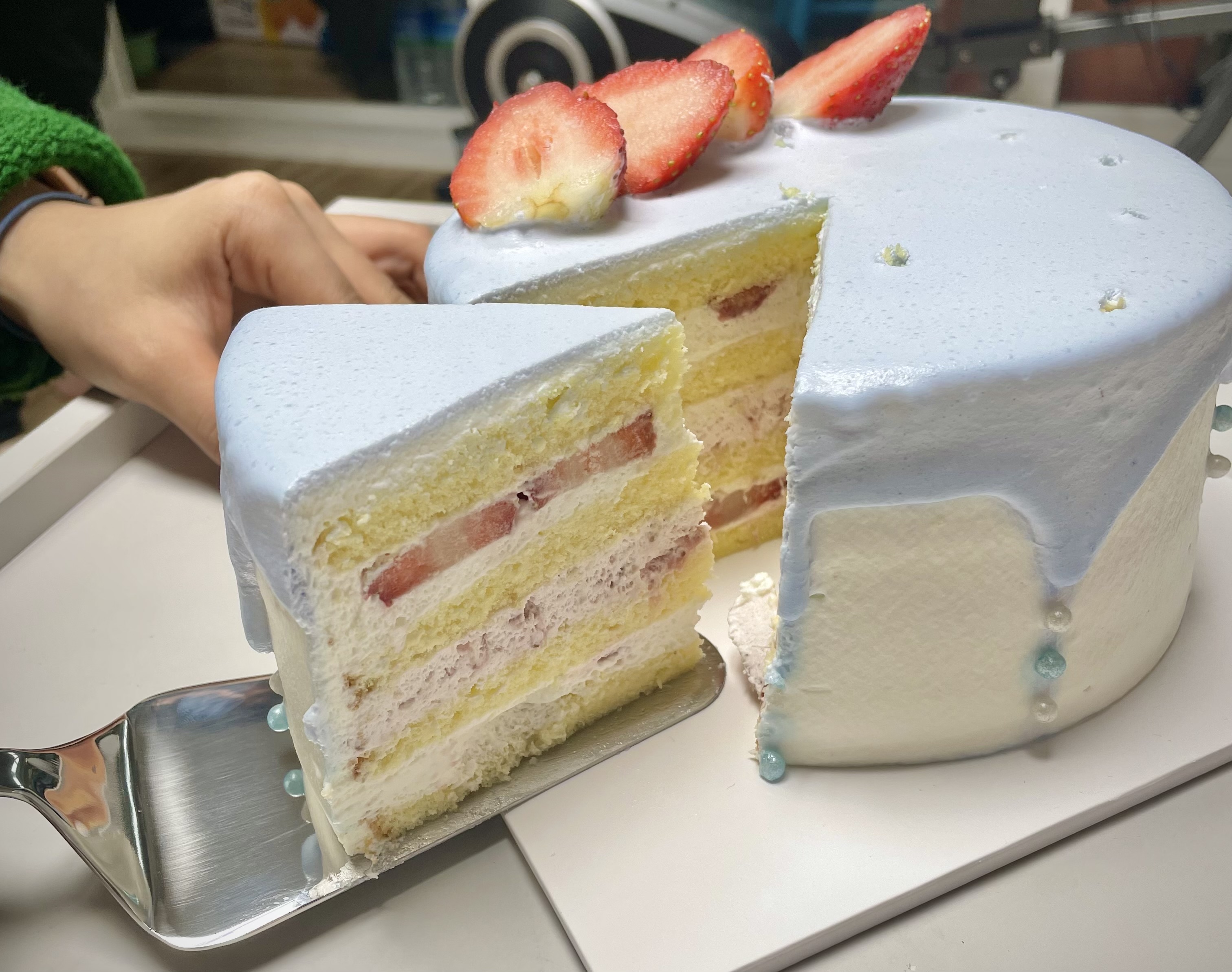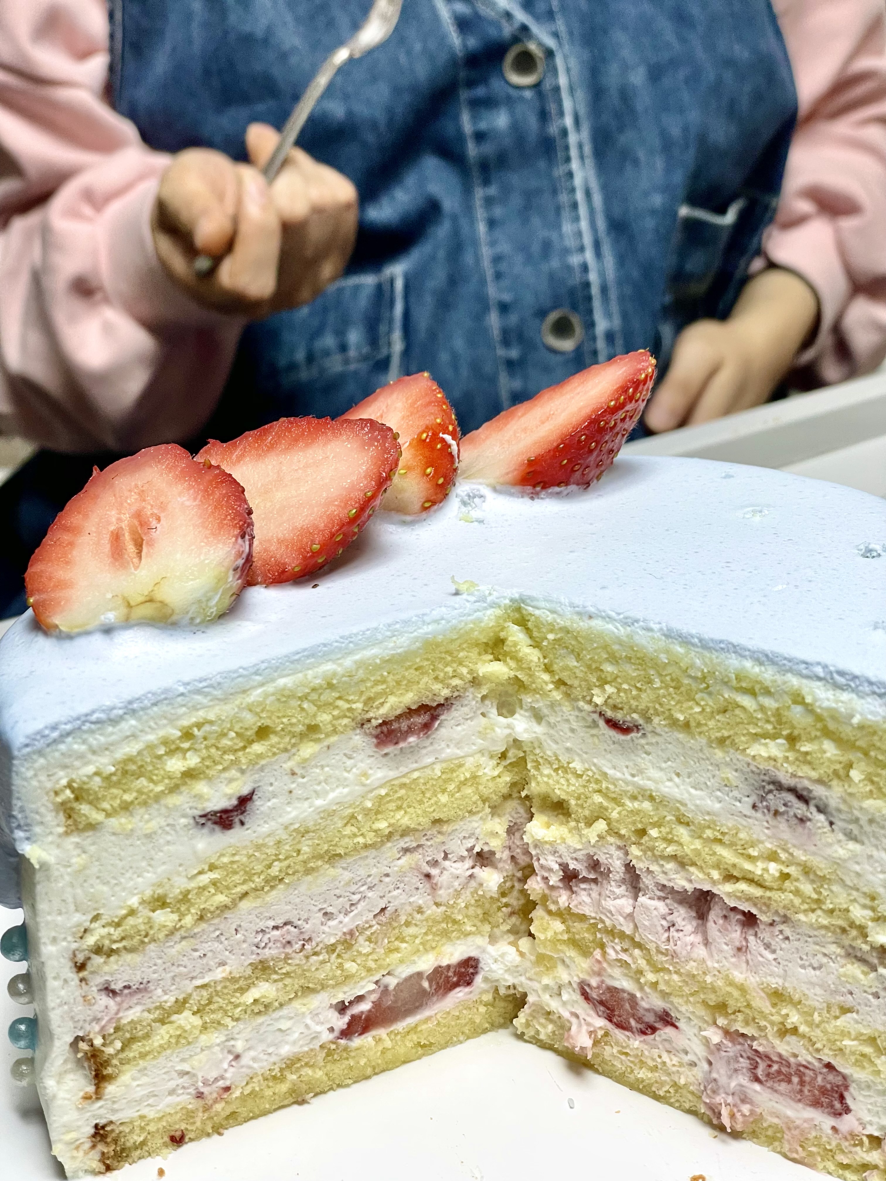 엄마도 함께 드셨느데 시트는 촉촉하고 케이크가 달지 않아서 맛있다며 계속 드셨어요. 특히 딸기란 과일이 누구나 좋아하는 호불호 없는 과일이라 좋은 것 같아요. 딸기 계절이라면 생딸기를 넣어 만들고, 만약 딸기를 구하기 좀 어렵다면 딸기 조림을 넣어 맛있는 케이크를 만들 수 있어요.