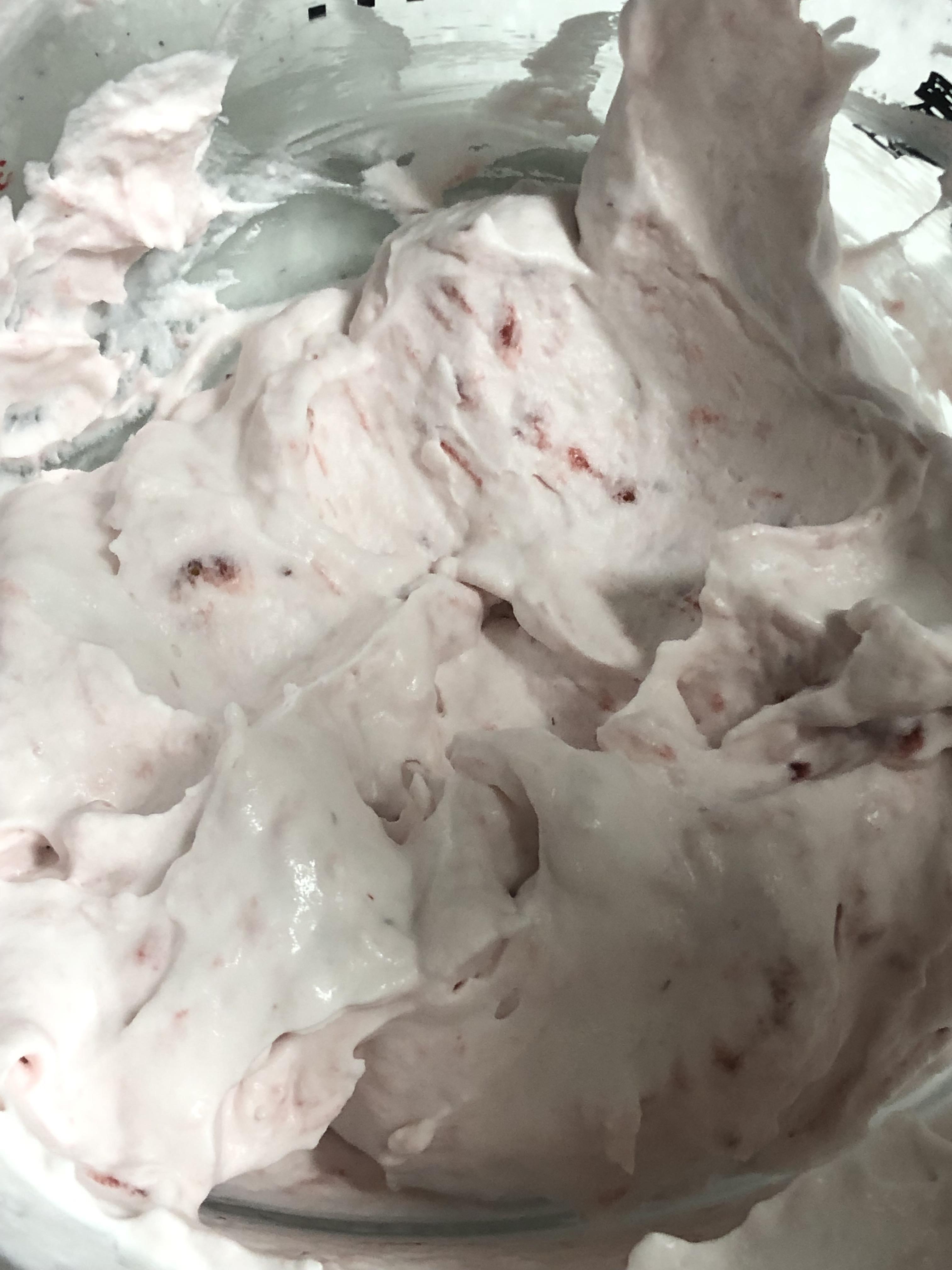 두번째 크림으로는 미리 만들어둔 딸기 조심을 넣어줍니다. 설탕을 첨가하지 않은 생크림 110g에 만들어놓은 딸기 조림을 전부 넣어줍니다. 딸기를 넣기 전에 미리 휘핑해놓고 딸기를 넣은 뒤 잘 섞어줍니다.