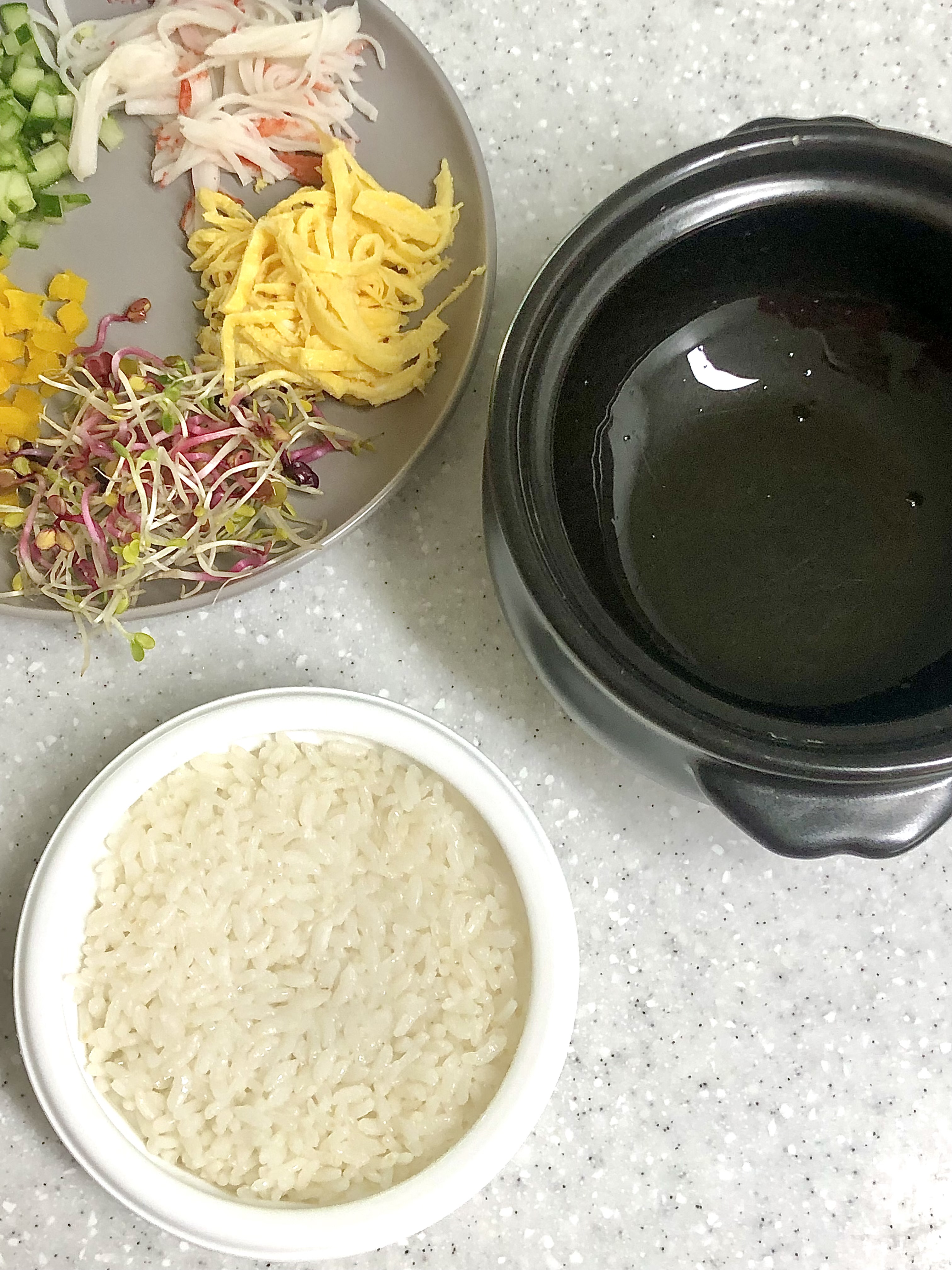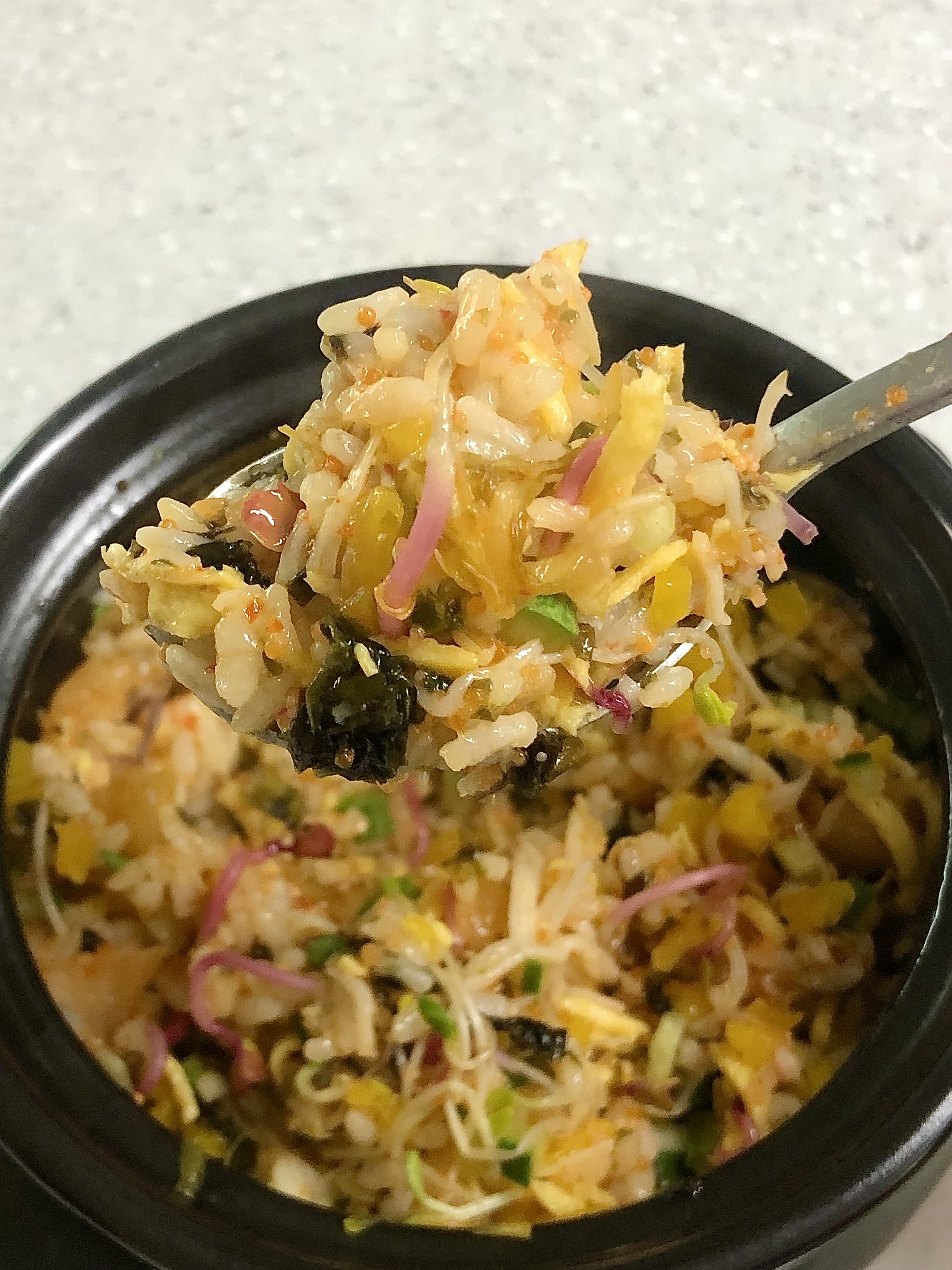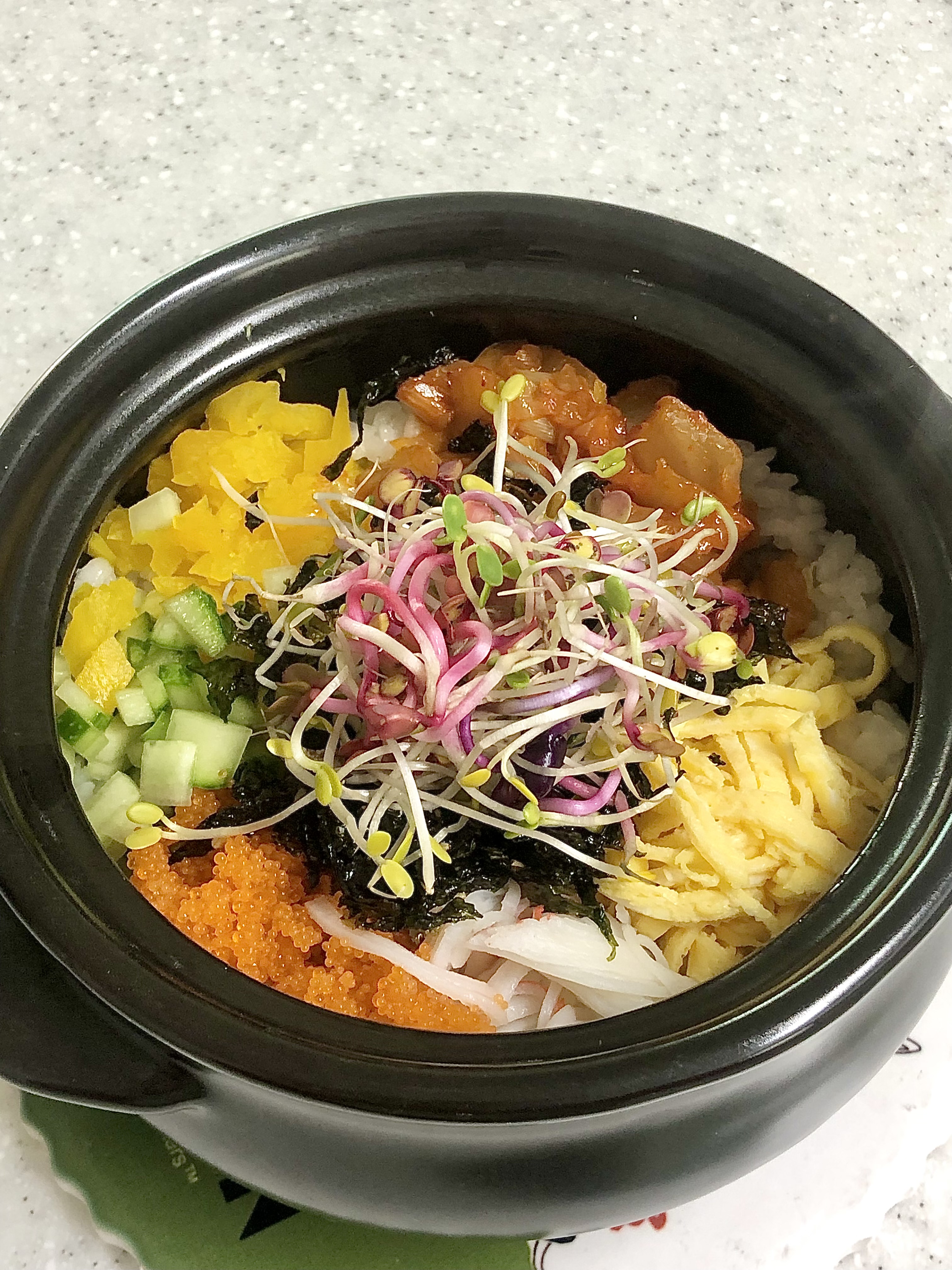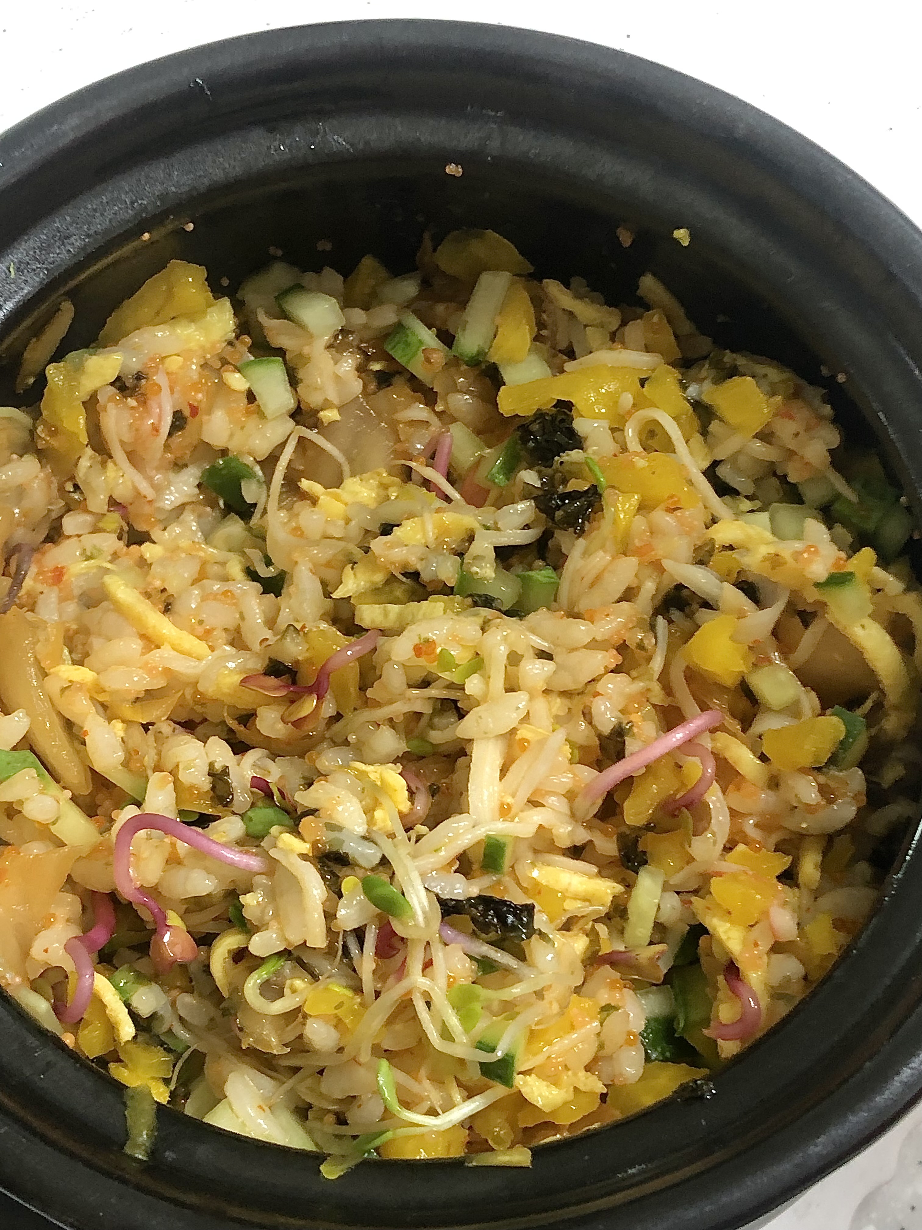 김가루와 새싹까지 올려서 마무리합니다. 밥과 뚝배기를 뜨겁게 데워줘야 차가운 재료가 들어가도 따뜻하게 먹을 수 있어요.