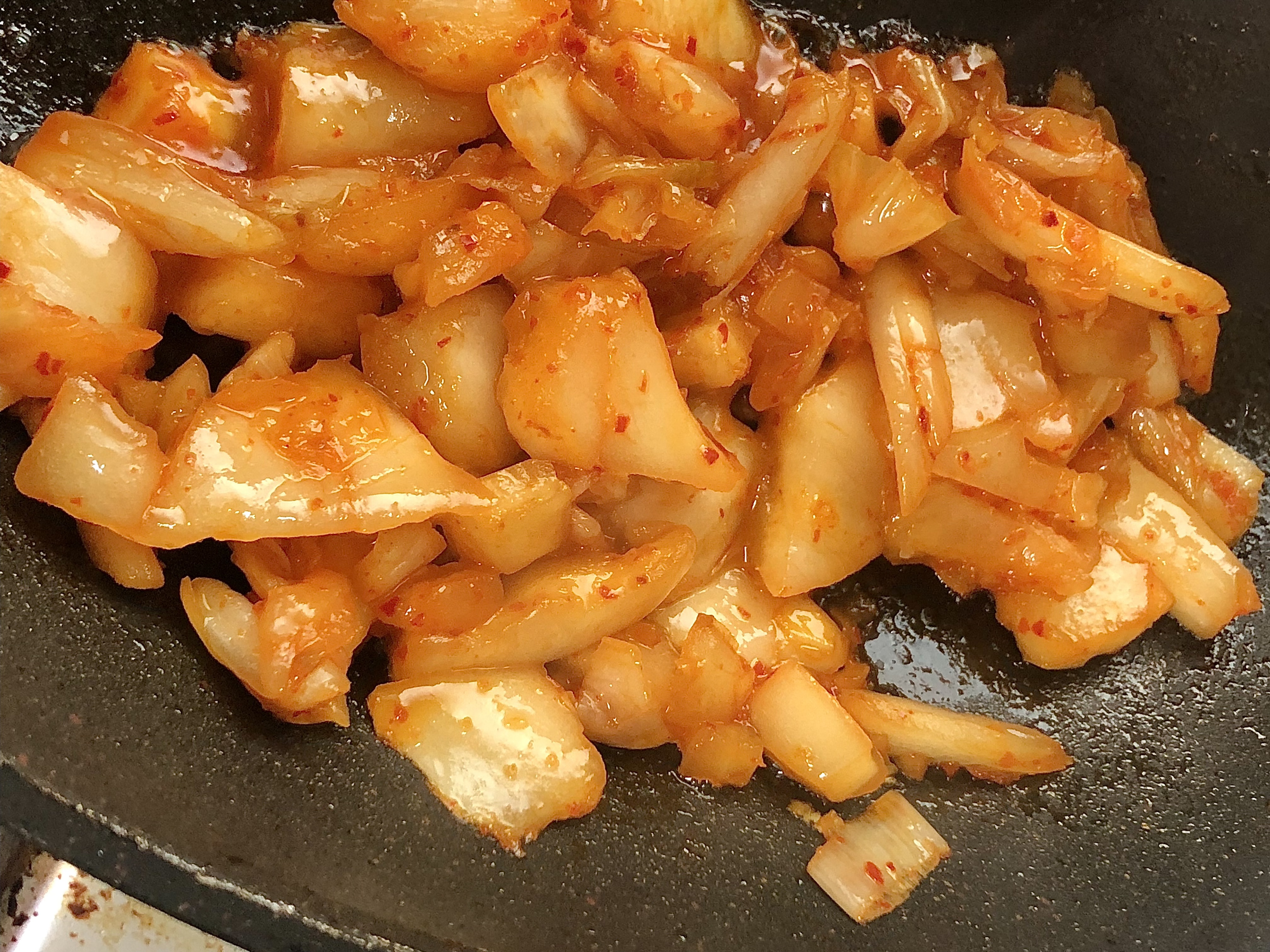 김치를 살짝 볶아줍니다. 그냥 설탕과 참기름에 버무렸다 넣어도 맛있지만, 전 살짝 볶아준 김치가 더 맛있더라고요. 볶음 김치의 맛에 따라 알밥의 맛이 좌지우지되니 원하는 스타일대로 김치를 볶아주면 됩니다. 전 들기름 한스푼에 설탕 한 티스푼을 넣고 간단하게 볶았습니다.
