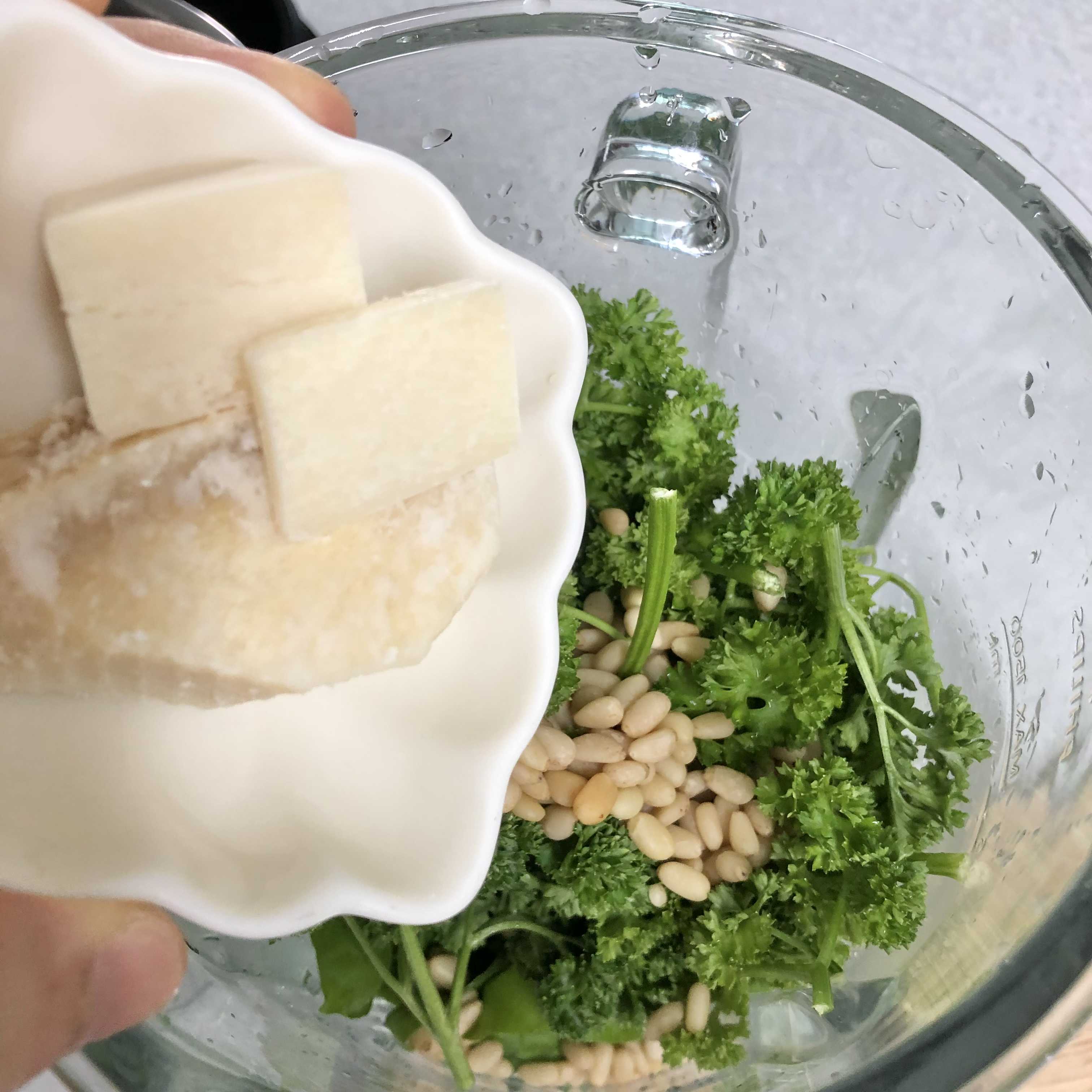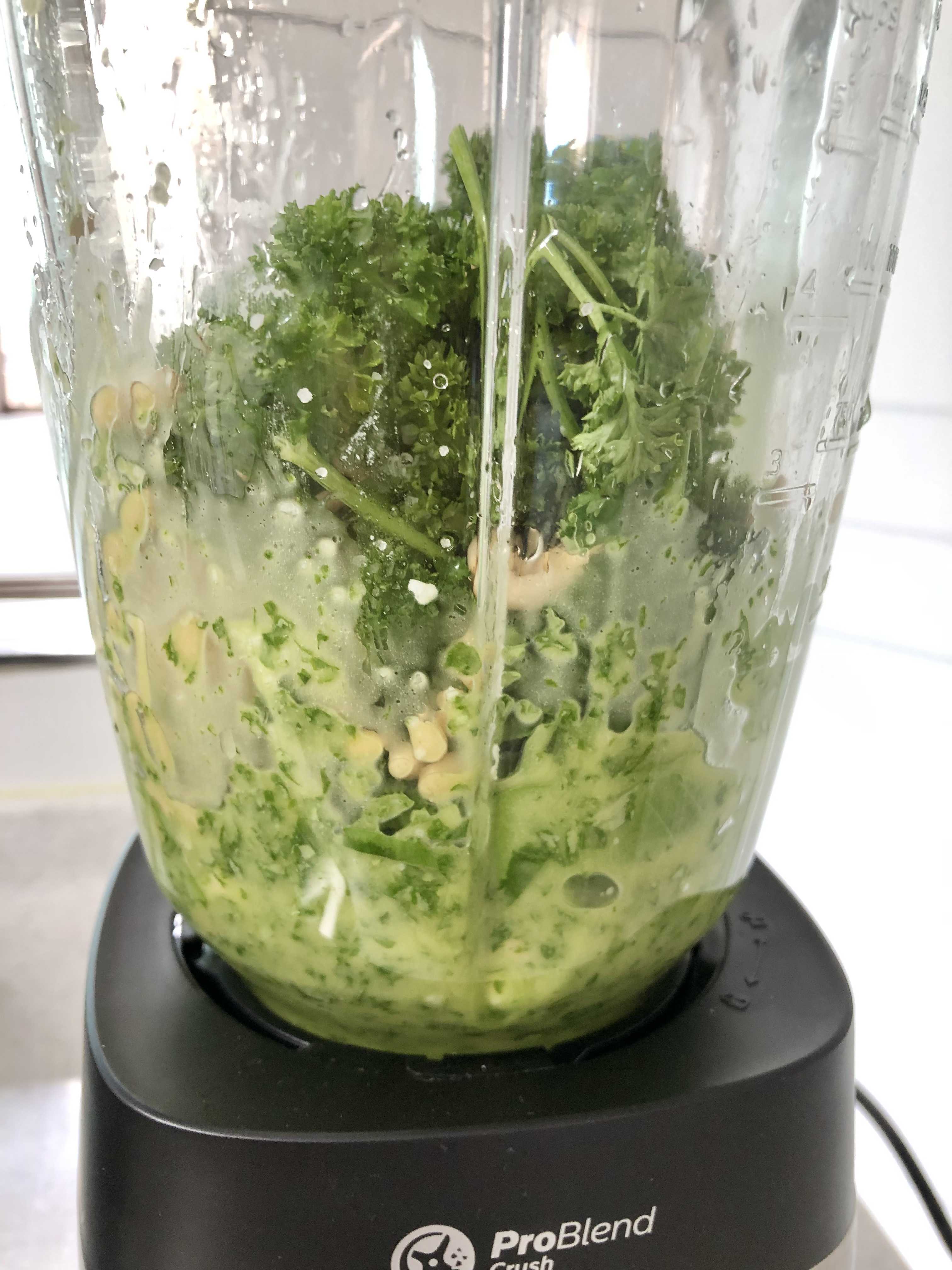 이번에 넣어본 재료는 바질 37g, 파슬리 4줄기(약 30g), 마늘 두 톨, 파마지아노 50g, 잣 28g, 소금 한 티스푼입니다.