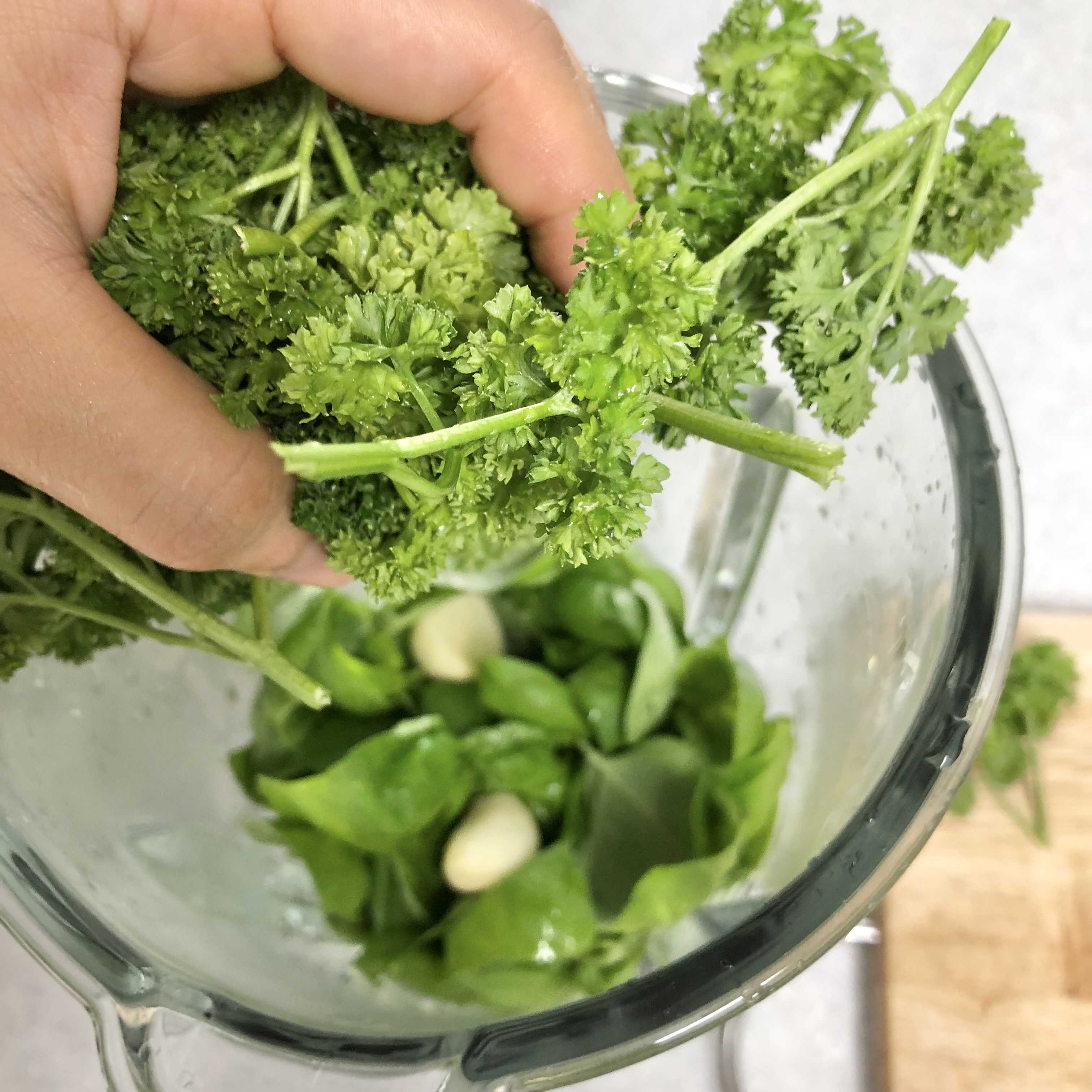 파슬리는 큰 줄기 부분은 떼어내고 복실복실한 머리 위주로 넣어줍니다.