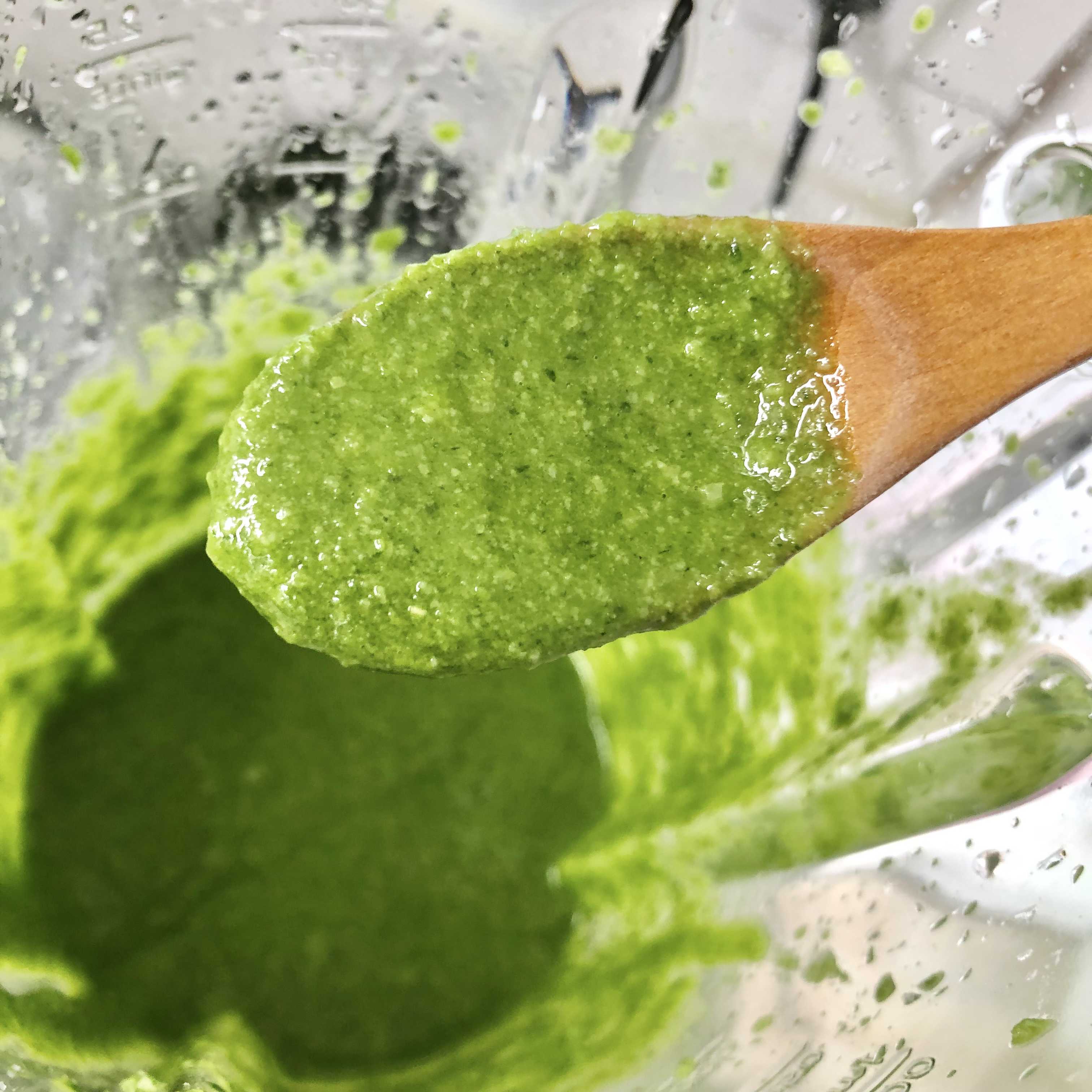 윙윙윙 갈다보면 이렇게 예쁜 초록색 페스토가 완성됩니다.